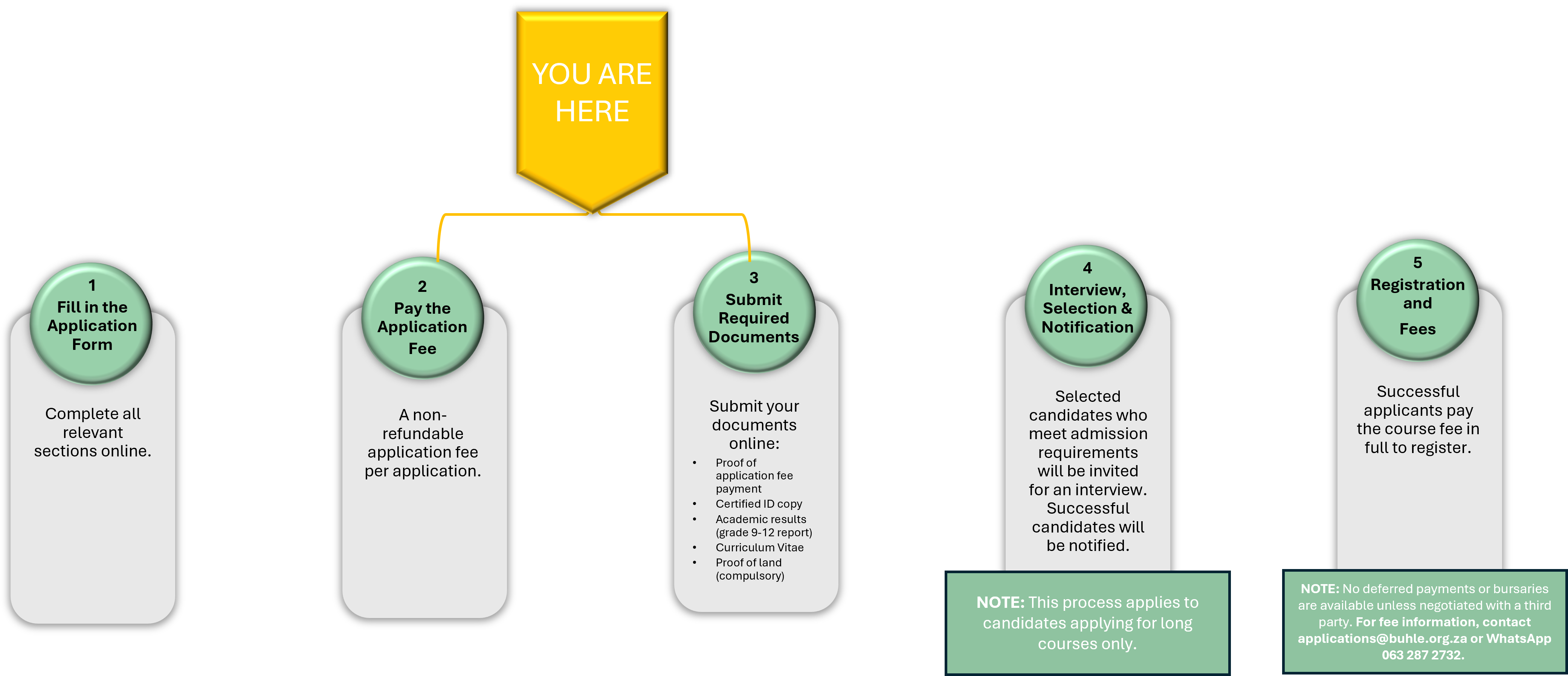 1. Make payment of R150 as per course listed below for application and send proof of payment to applications@buhle.org.za